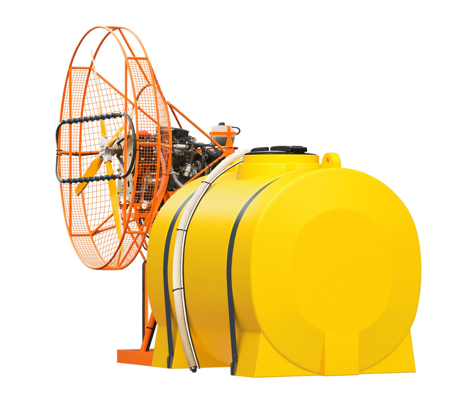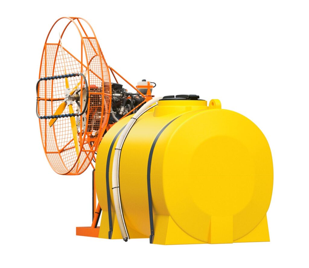 Химический насос стабильно и равномерно подает препараты из бака к форсункам на вентиляторе. Форсунки распыляют смесь в создаваемый винтом воздушный поток. Аэрозоль летит с потоком воздуха на расстояние до 150 м. Вентилятор возможно поворачивать в любую сторону в пределах 90 градусов.