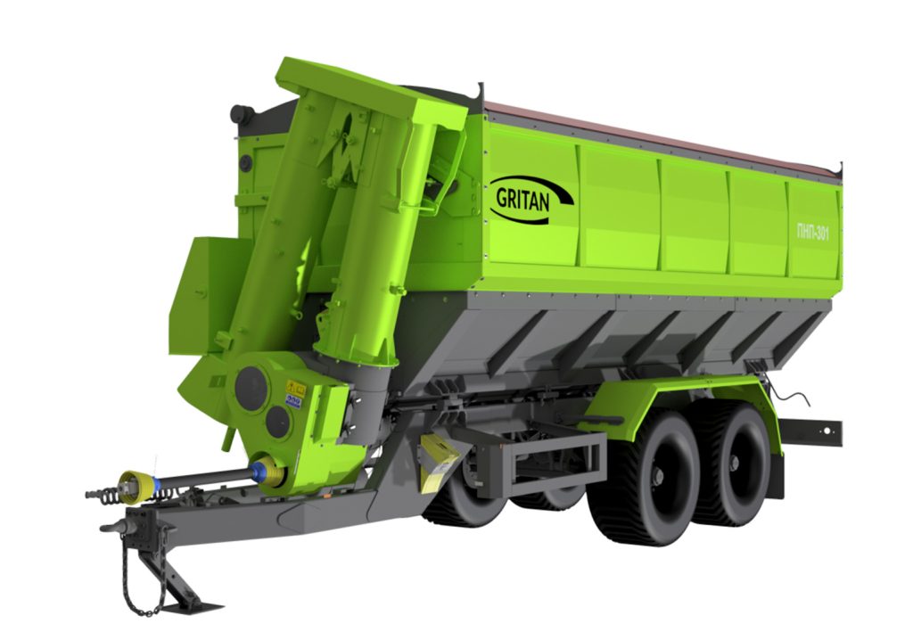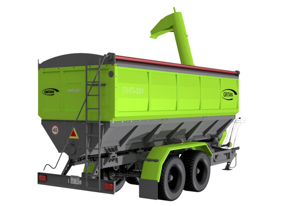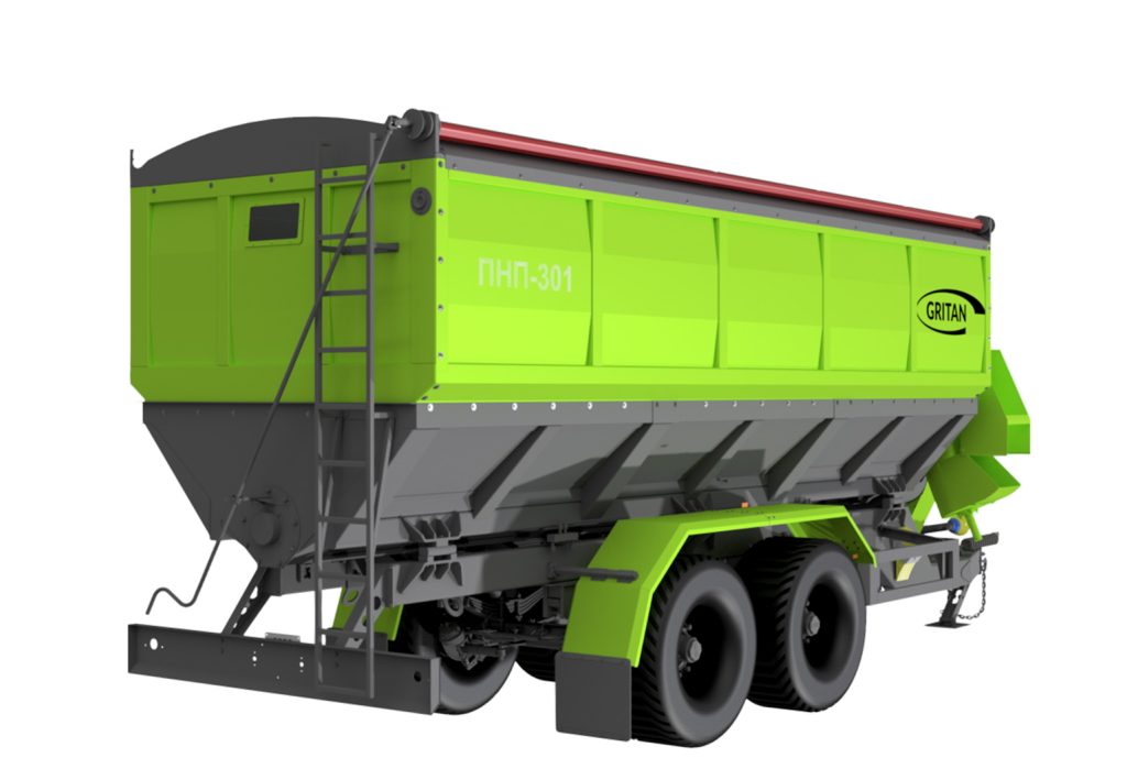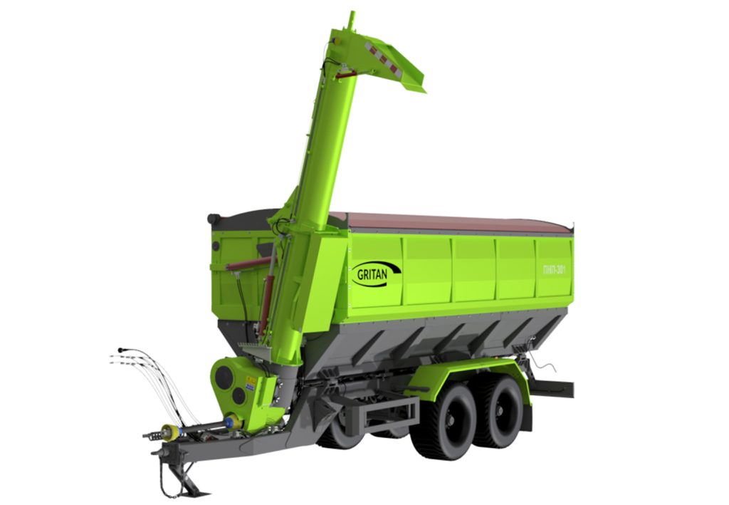 Двухосный полуприцеп-накопитель-перегрузчик для посевных и уборочных работ зерновых, бобовых, масленичных культур и внесения сыпучих удобрений.
